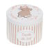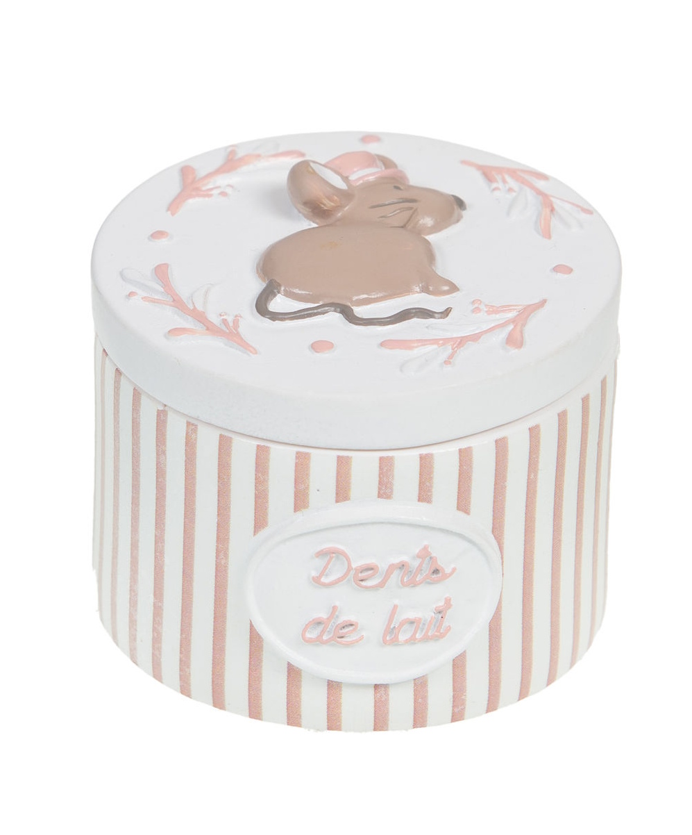 Cette petite boite à dents de lait ronde en résine peinte à la main à rayures roses avec une petite souris sur le couvercle sera parfaite pour conserver les quenottes de votre mini !