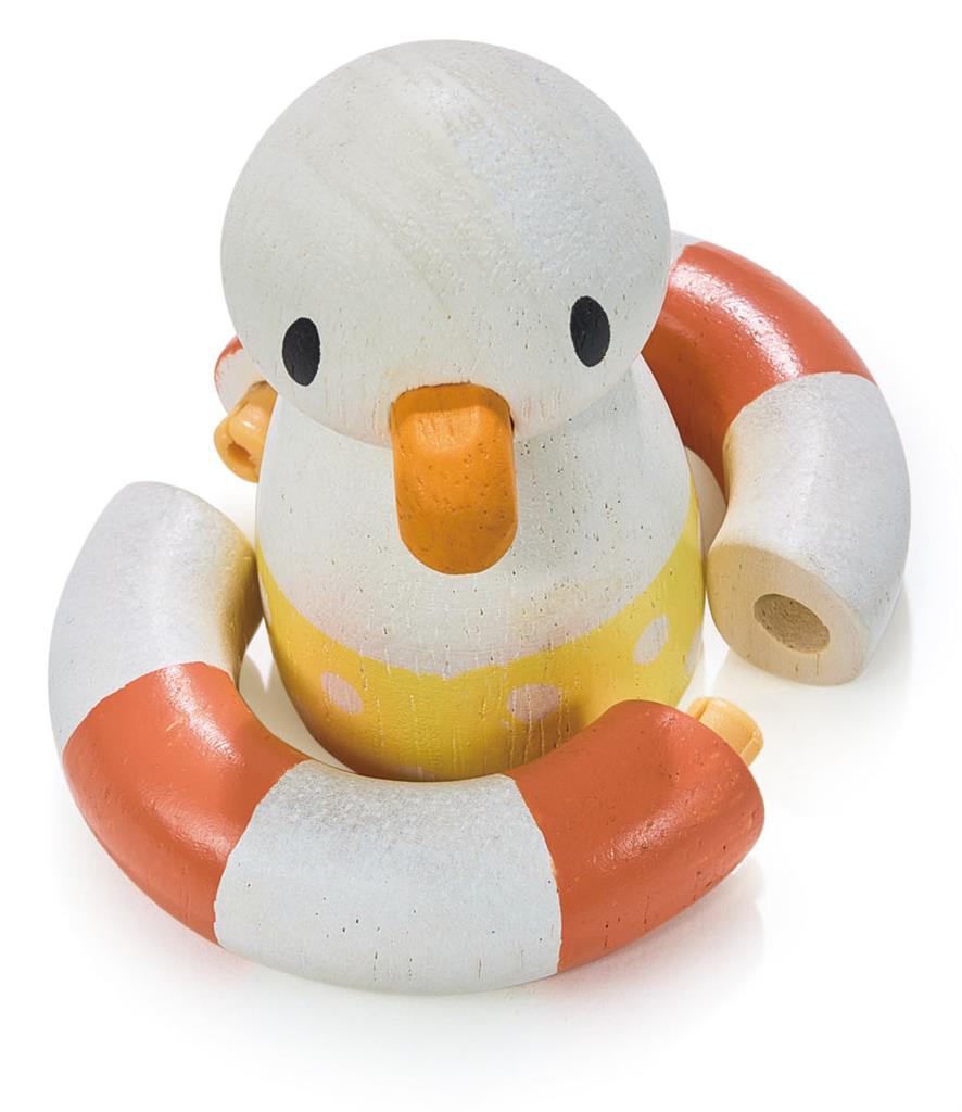 Regardez Gully, le papa mouette, qui a un bonnet tricoté et un anneau en bois amovible en forme de caoutchouc.