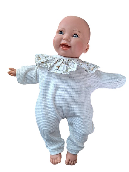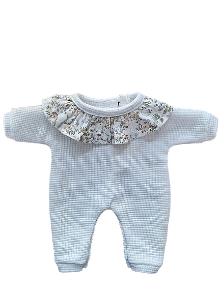 Adorable combinaison en coton gaufré nid d’abeille blanche avec un col volanté imprimé assorti.