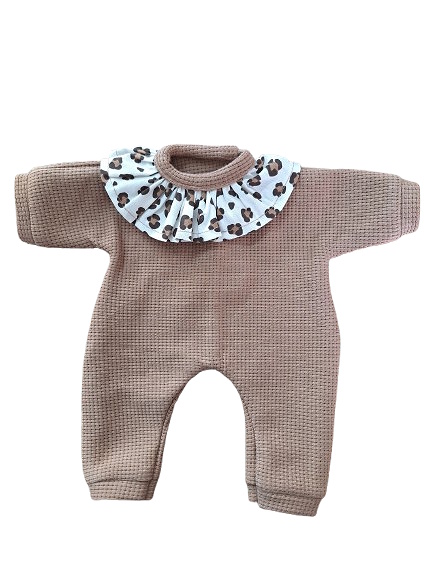 Adorable combinaison en coton gaufré nid d’abeille avec un col volanté imprimé.