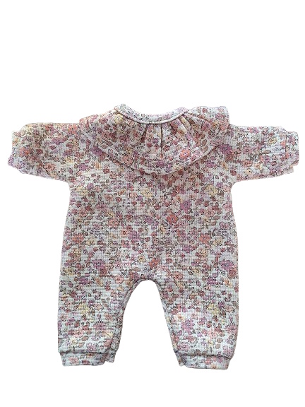 Adorable combinaison en coton gaufré nid d’abeille imprimé fleurs d’inspiration Liberty avec un col volanté imprimé assorti.