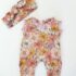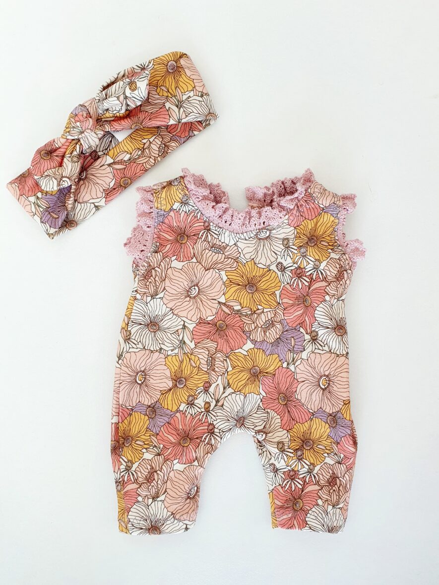 Adorable combinaison à manches courtes impression florale mauve et jaune agrémentée de dentelle mauve au cou et aux manches avec son bandeau assorti