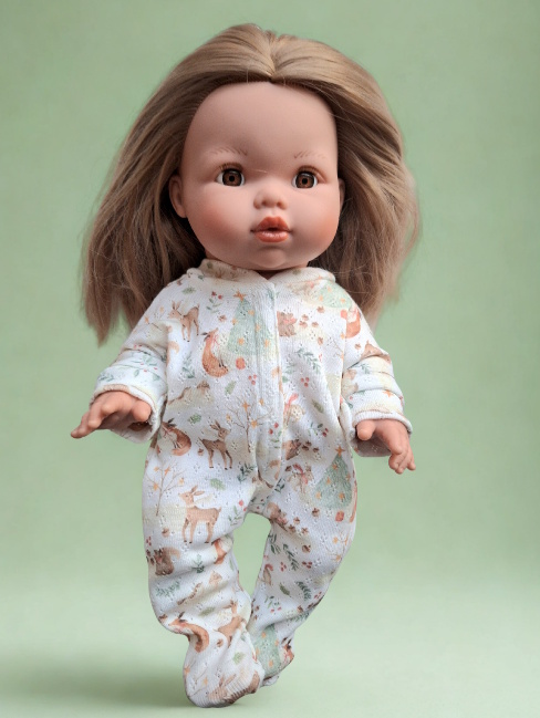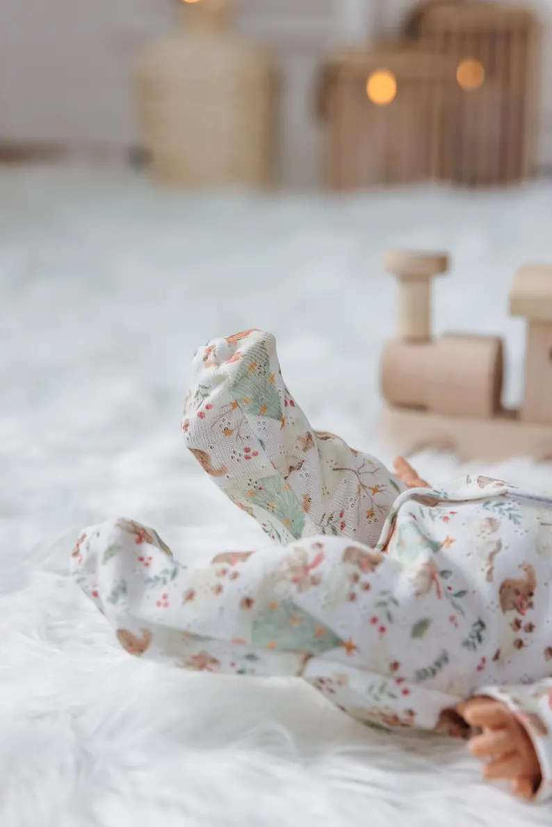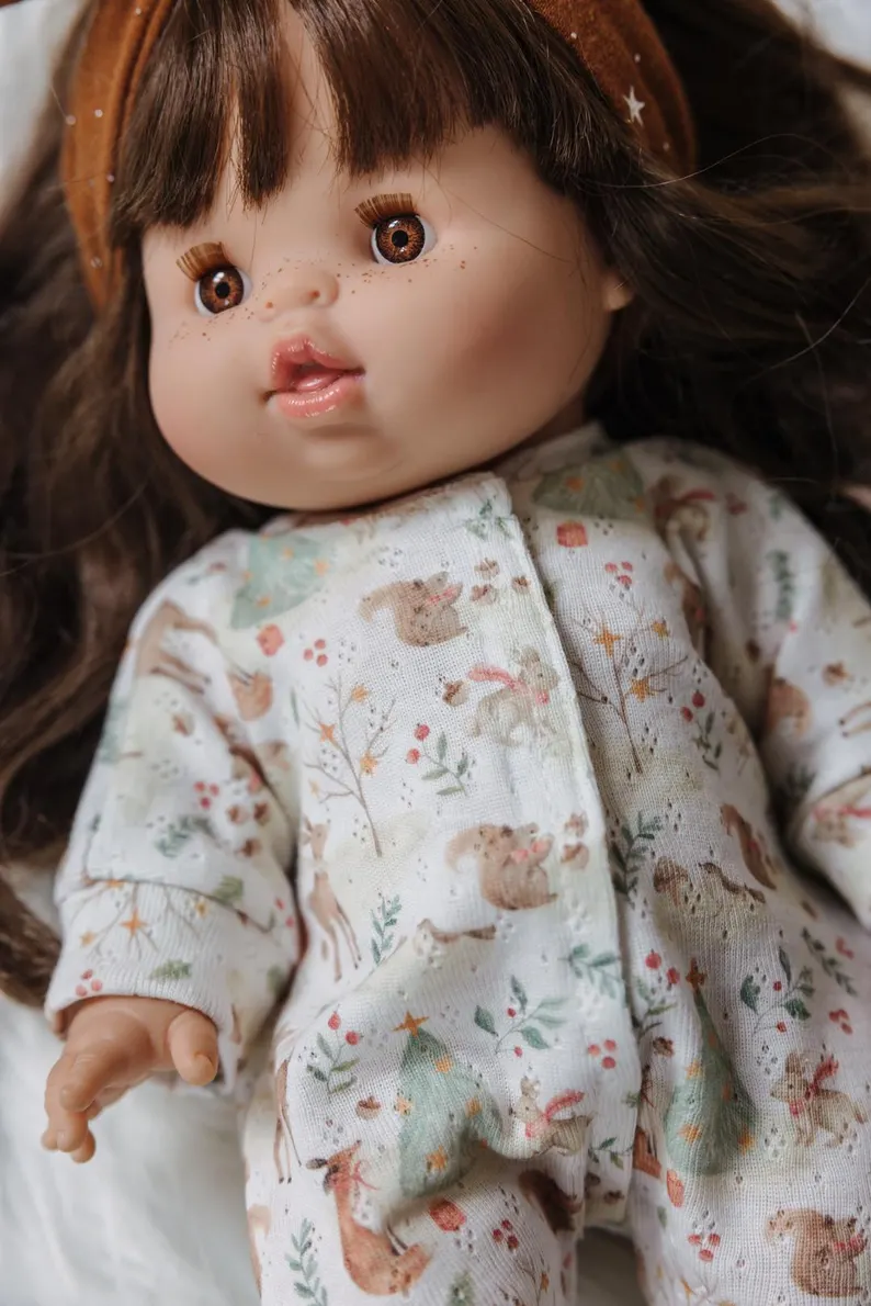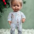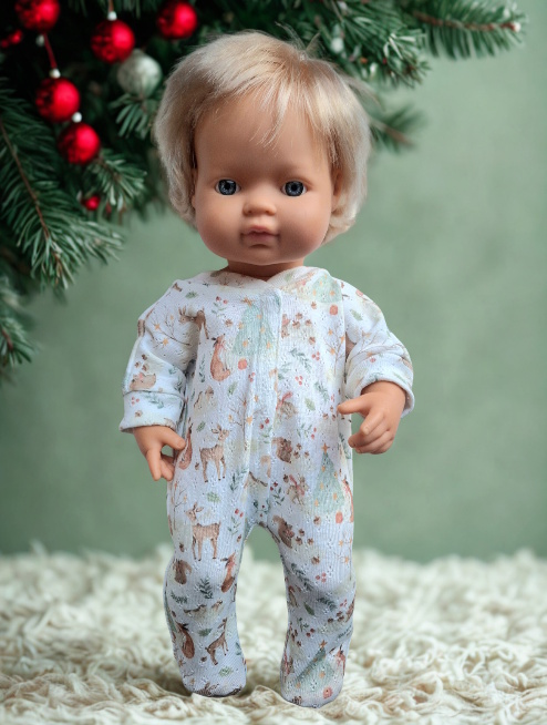 Adorable combinaison à pieds tissu imprimé inspiration Noël des animaux pour une poupée de 34 cm environ.