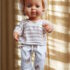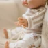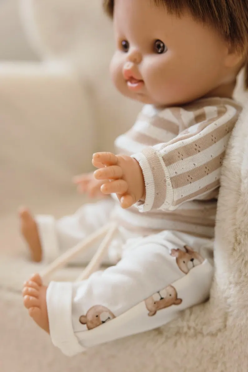Le set comprend un sweat-shirt coton maille pointelle rayé beige sur fond blanc et un pantalon coton imprimé oursons sur fond blanc