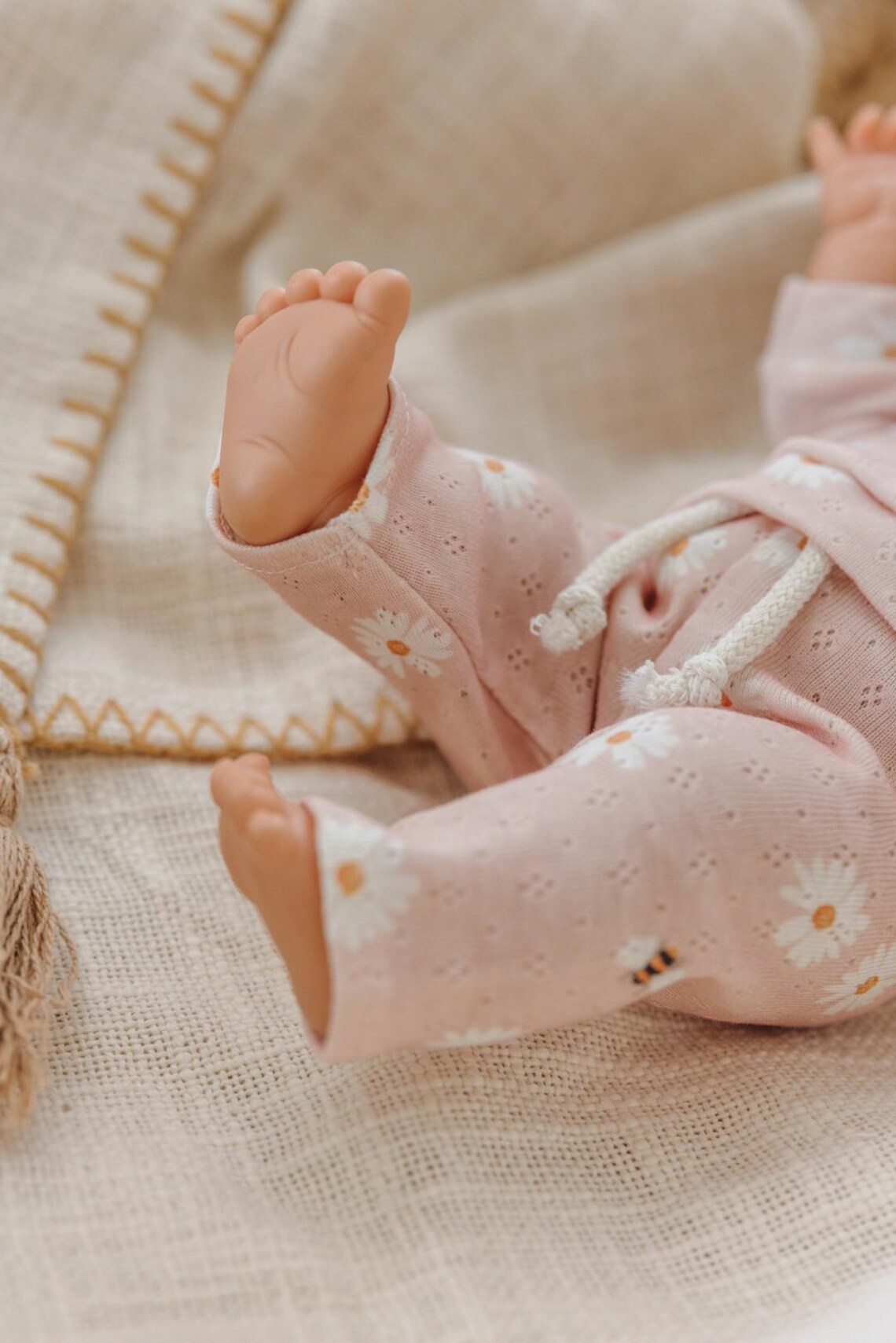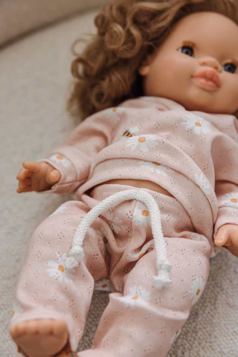 Le set comprend un sweat-shirt à capuche imprimé marguerites et abeilles sur fond rose à maille pointelle ajourée et un pantalon assorti