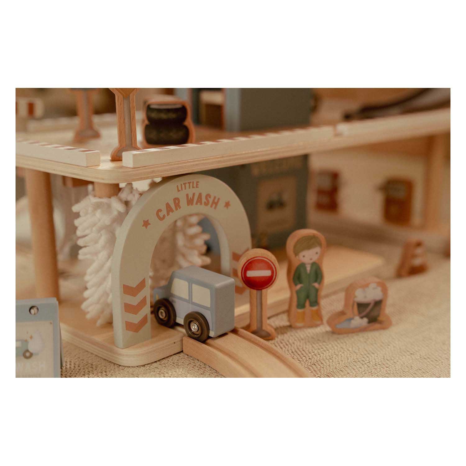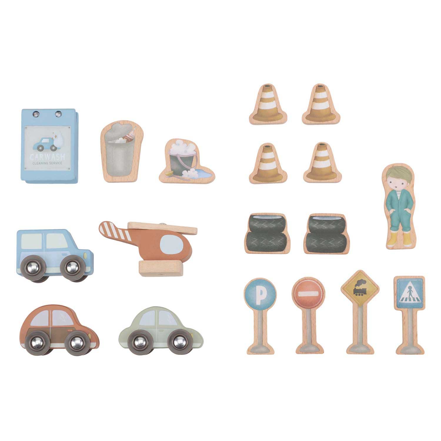 Il contient aussi des accessoires en bois comme des panneaux de signalisation, des pneus empilés et un seau, ainsi que trois véhicules et un hélicoptère.