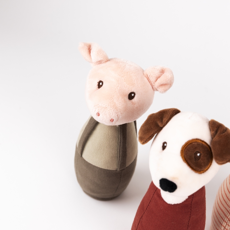 Ce superbe jeu de 6 quilles les amis animaux avec leurs « habits » colorés plaira à coup sûr à vos minis.