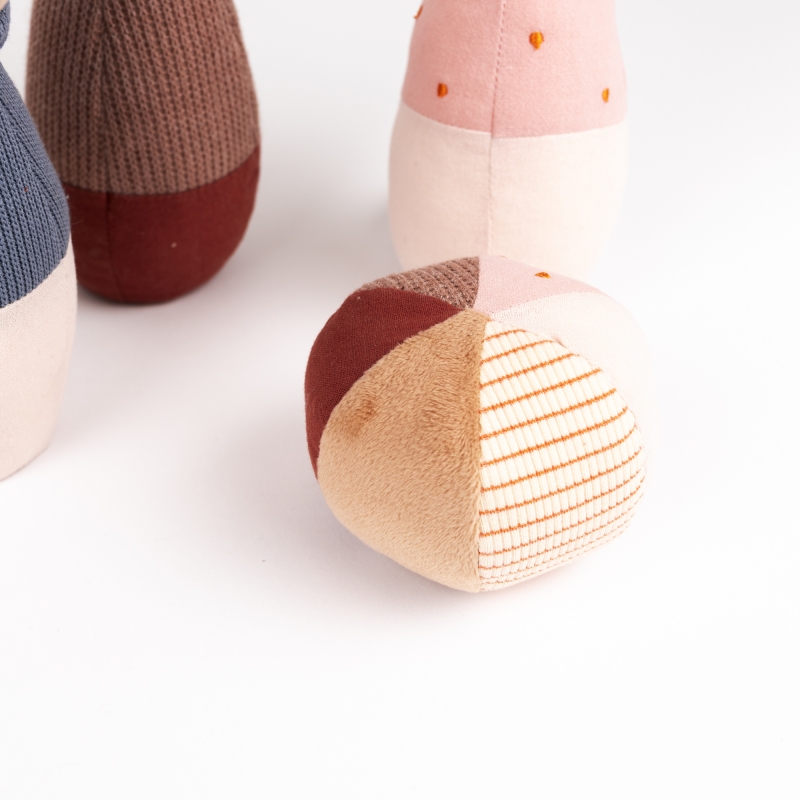 Aidez votre enfant à installer les quilles puis visez et lancez la balle pour faire tomber les quilles.