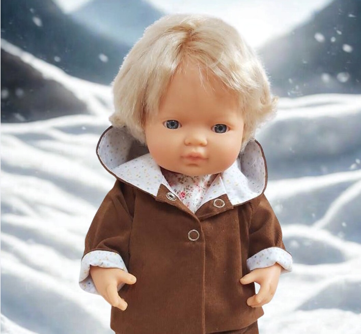 Adorable petit manteau à capuche en velours brun doublé tissu à pois pour une poupée de 34 à 38 cm environ.