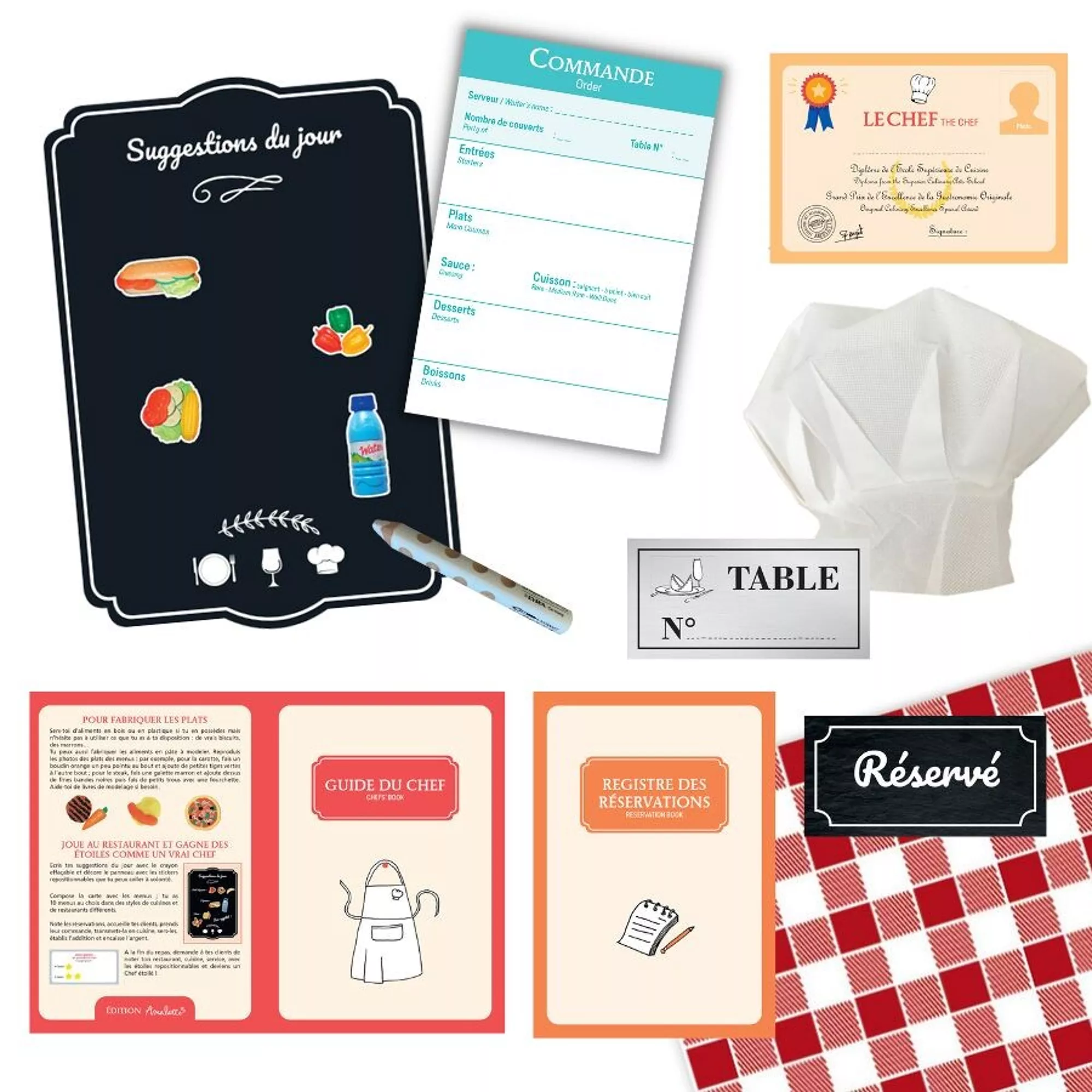 Destiné aux enfants de 5 à 10 ans, ce kit leur permet de s’imaginer chef, serveur ou client tout en développant leurs compétences leur curiosité et leur autonomie grâce aux accessoires réalistes et amusants.