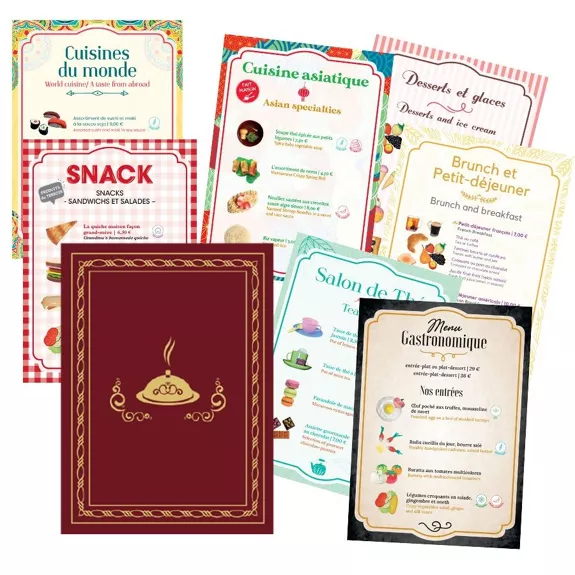 • une carte imitation cuir avec 10 menus tendances et variés (brunch, bistro, cuisine du monde, pizza, burgers, salon de thé…) bilingues français / anglais,