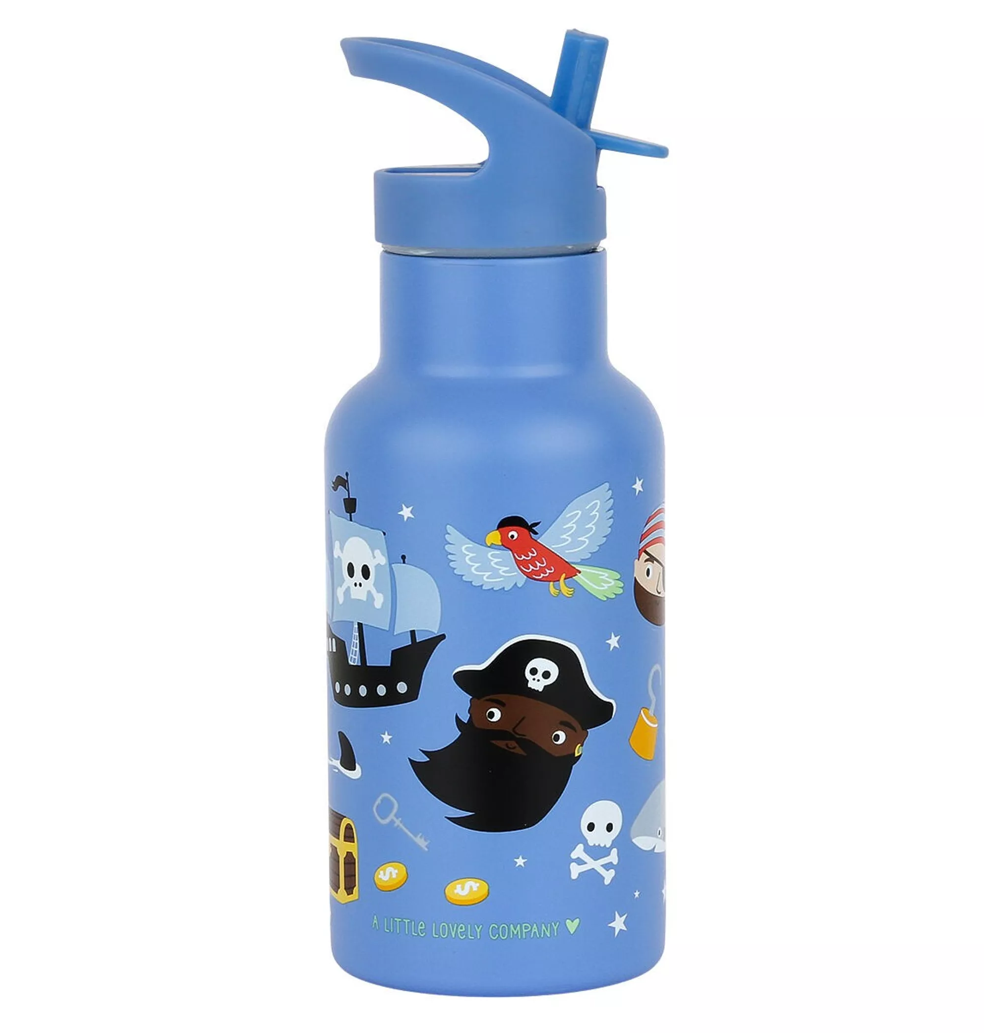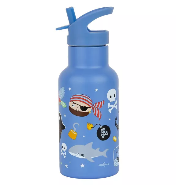 Jolie gourde en acier inoxydable décor pirates sur fond bleu qui gardera les boissons au frais !