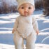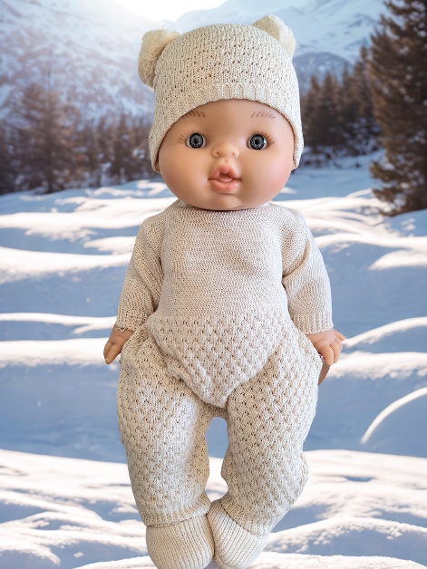 Une jolie poupée aux yeux bleus avec sa tenue d’hiver en coton Bio comprenant 1 combinaison sans pieds tricotée, 1 bonnet à pompons et ses chaussons assortis en coton biologique écru.