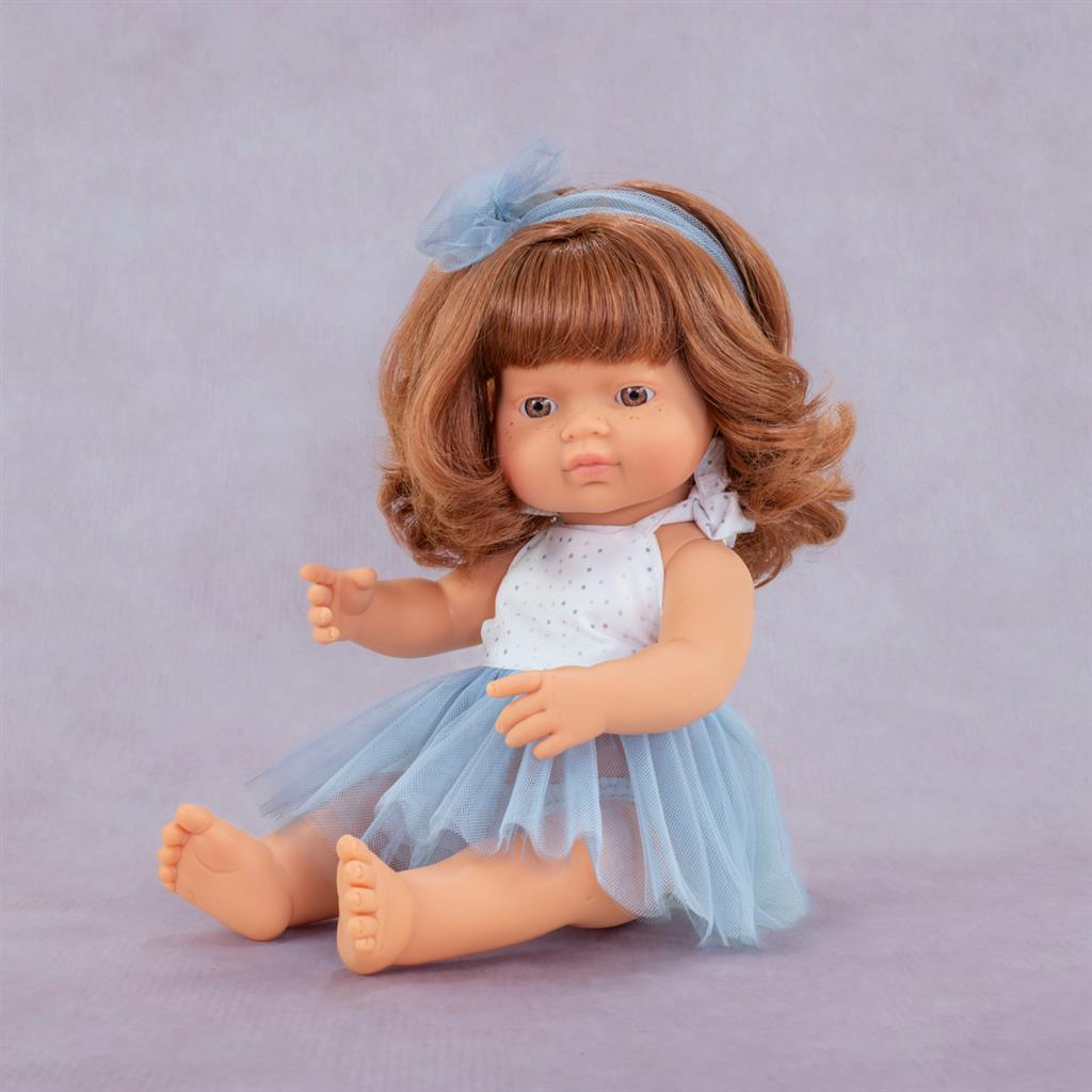 Votre enfant va aimer dorloter cette poupée aux cheveux roux vêtue d’une jolie robe avec jupon en tulle bleu clair et haut imprimé sur fond blanc!