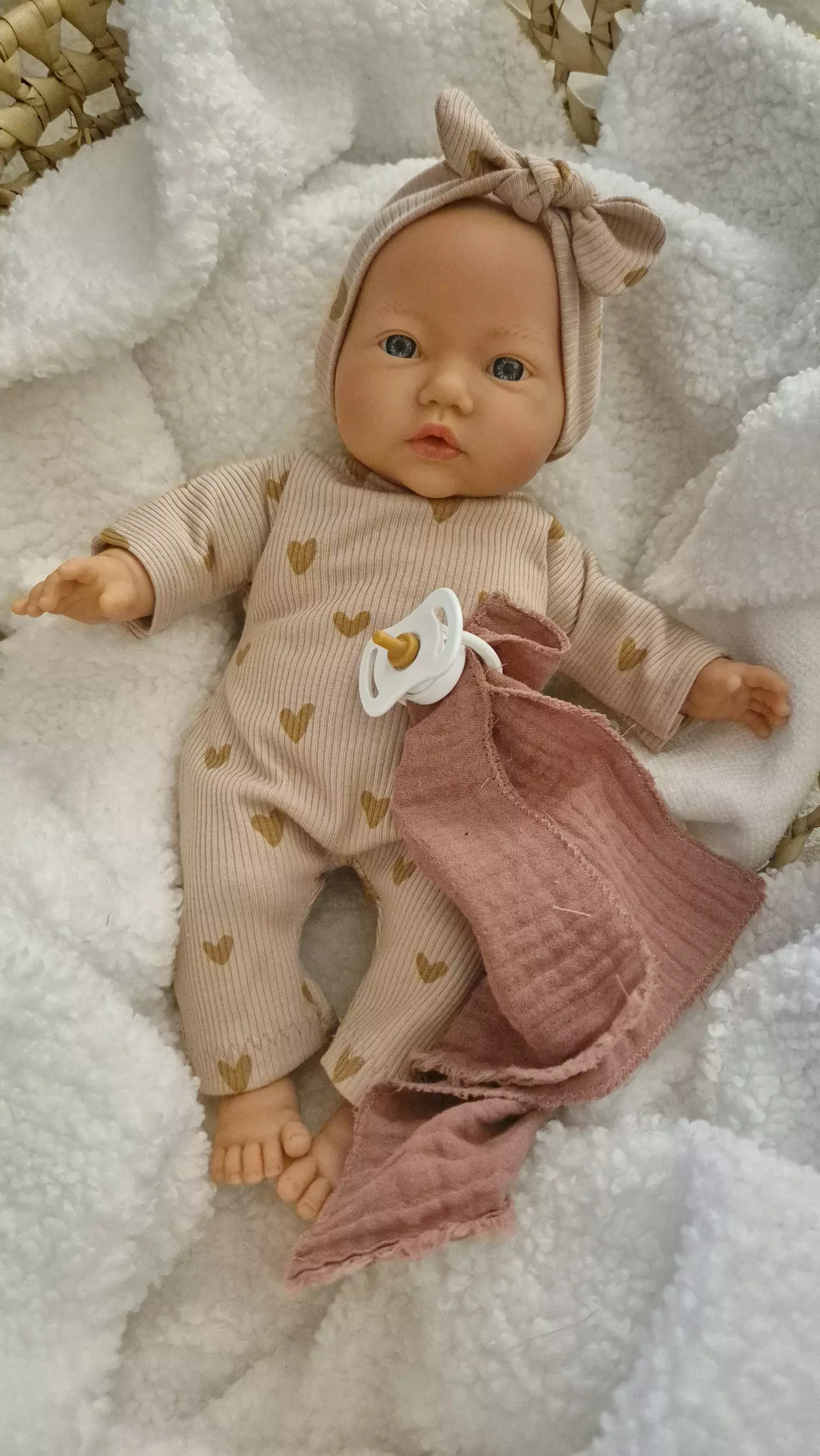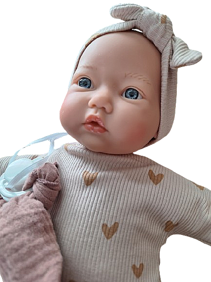 Un adorable poupon 30 cm rêveur et sa sucette en combinaison nude imprimée cœurs bruns avec bandeau assorti et petit doudou uni