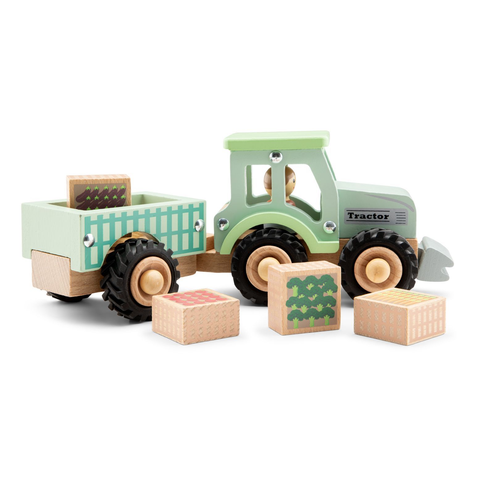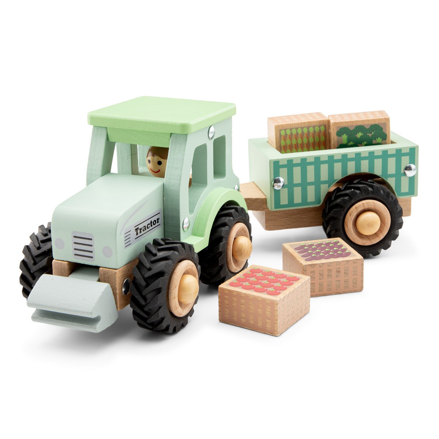 Le set comprend un tracteur et un fermier avec une remorque amovible remplie de légumes.